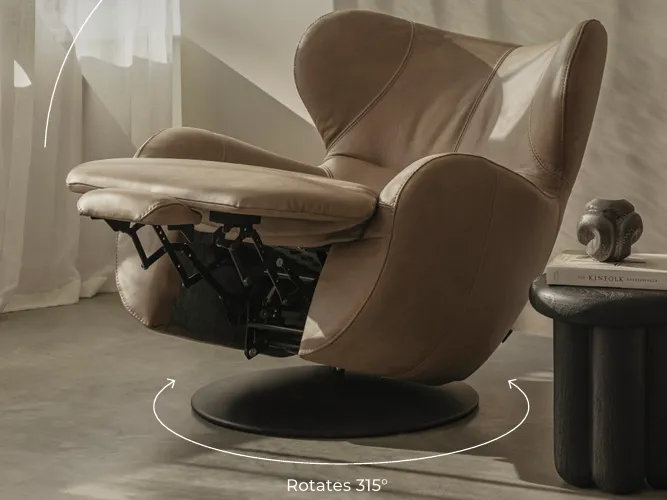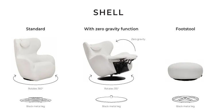 La chaise et le repose-pieds SHELL, conçus par Ian Archer, sont le rêve de tout amateur de design et de confort. Le fauteuil est doté d'accoudoirs et de dossiers incurvés, d'un appui-tête enveloppant, d'une rotation et de deux options pour la base : une structure métallique ronde et un coussin d'aspect solide, ajoutant vraiment à sa fonctionnalité. Tandis que le repose-pieds qui l'accompagne, telle une pierre de plage parfaitement arrondie et formée, complète et complète ce bel ensemble. Une pièce/collection exquise avec une silhouette époustouflante.